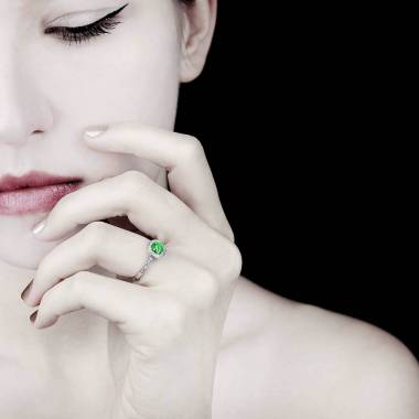 エメラルドは、一目見ればわかる緑色をした貴石で、ハーブ・グリーンと呼ばれています。色で人々を魅了するのはもちろんですが、それだけではありません。この宝石の特徴は、内包物が含まれていることこそが本物の証となる点です。これが有名な「エメラルド・ガーデン」です。また、エメラルドによく似た色の半貴石であるツァボライトのエンゲージメントリングを選ぶこともできます。
