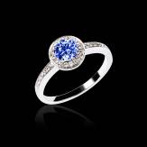 Bague en or 18 K (2,6 g), pierre centrale saphir bleu (1 carat; 1,5 carats, 2 carat) et pavage diamant (0,14 carat) ou rubis (0,16 carat) ou émeraude (0,11 carat) ou saphir bleu (0,16 carat) ou saphir rose (0,16 carat) ou diamant noir (0,14 carat)
