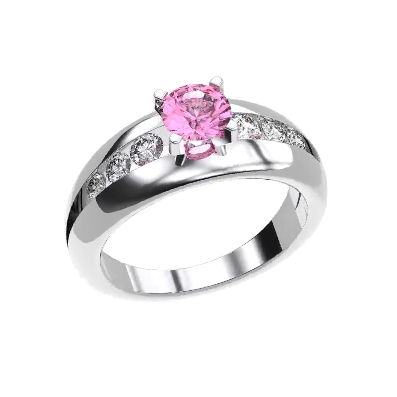 Bague saphir rose Léa en or blanc palladié (6.5 gr) 18K, or jaune 18K (6.1 gr), or rose (6.1 gr) ou platine (8.00 gr). Pavage diamants (0.40 carat) diamant noir (0.40 carat), rubis (0.45 carat) émeraude (0.30 carat) saphir bleu (0.45 carat), saphir rose (0.45 carat).