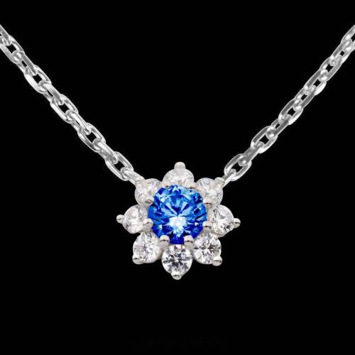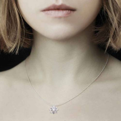 Pendentif saphir rose en or blanc palladié 18K, (2 gr) or jaune 18K (2 gr), or rose 18K (2 gr) ou platine (3 gr). Pour une pierre centrale rubis de 0.50 carat, pavage de 8 pierres soit en diamant (0.72 carat) ou diamant noir (0.72 carat) ou émeraude (0.60 carat) ou rubis (0.80 carat) ou saphir (0.80 carat). Chaîne forçat limée en or 18K 40 cm maillon 1 mm
